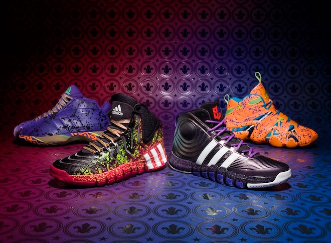+Adidas Basketball all-star collection has been released. With various color to fit any style, this should be on evryones must have list. This year's All-Star collection reflects New Orleans. Inspired by both the city and culture of New Orleans are adidas Basketball‘s uniforms for the upcoming 2014 NBA All-Star Game. Featuring a vibrant Mardi Gras color palette with shiny brass and metallic silver accents, the short-sleeved silhouettes don Louisiana’s fleur-de-lis across the chest as “East” and “West” logos come carved out of the iconic symbol.